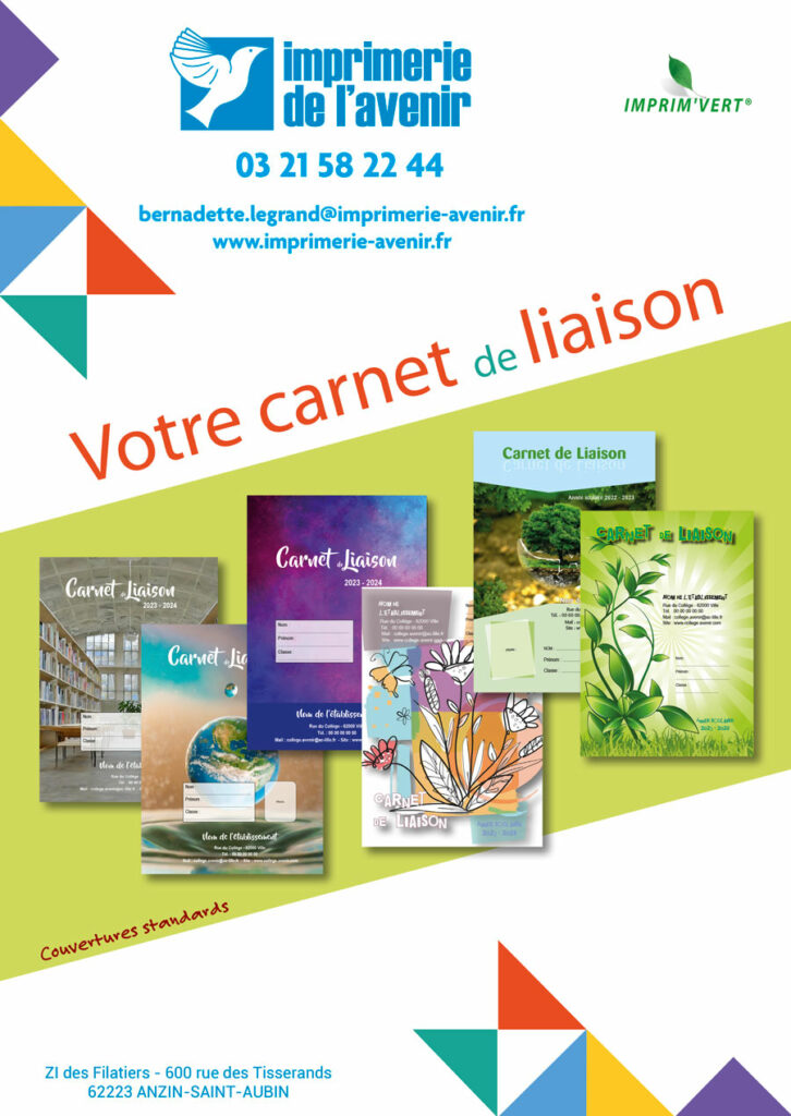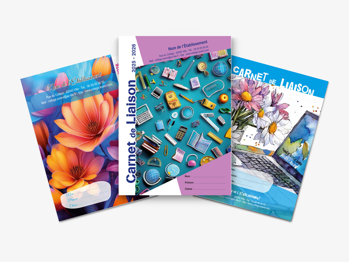 Nos couvertures de carnets de liaison sont prêtes à l’emploi, mais peuvent être personnalisées avec la photo et le logo de votre établissement.